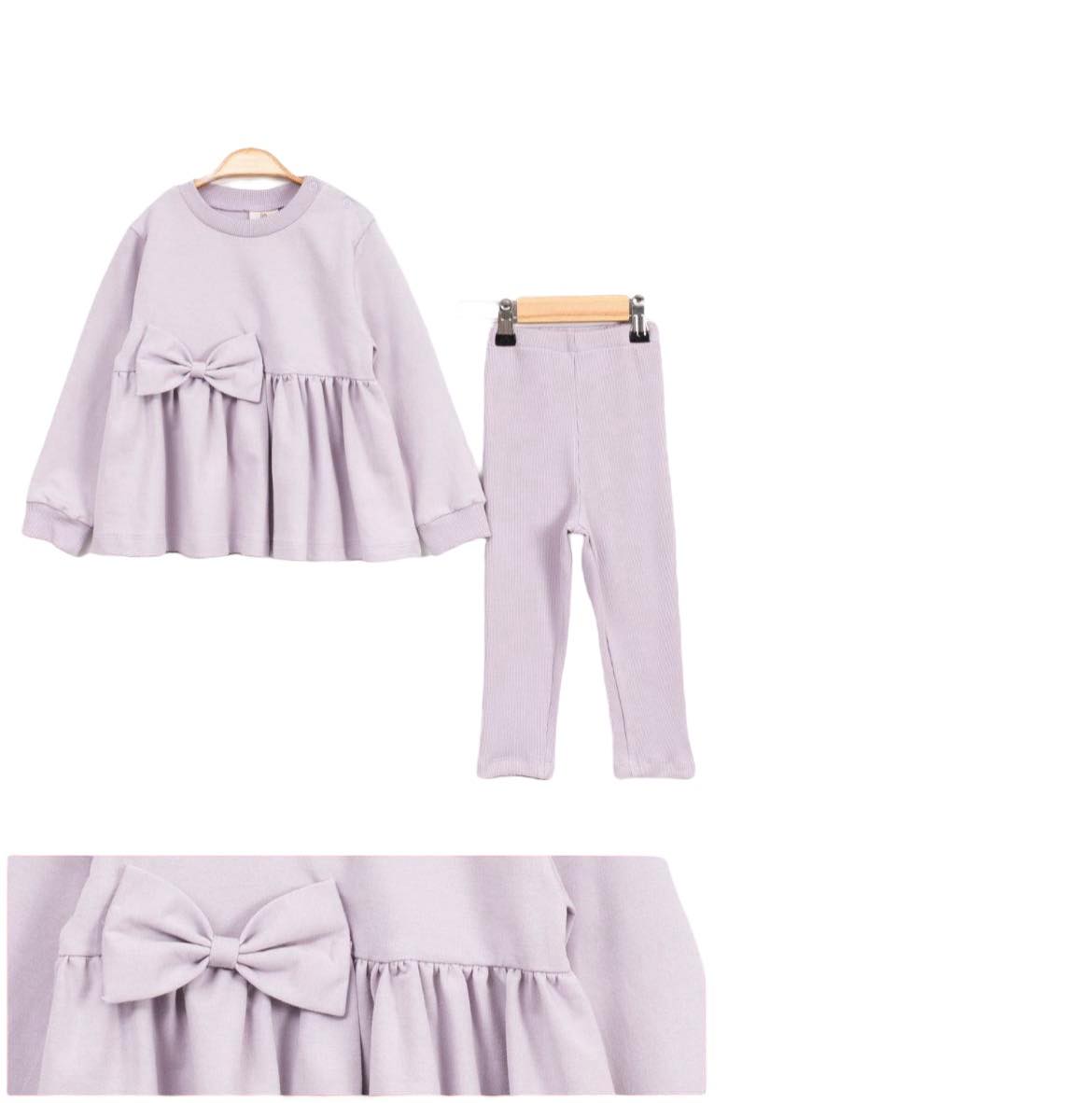 Komplet dziecięcy w kolorze liliowym posiadający rozkloszowaną tunikę z kokardką oraz legginsy prążkowane.