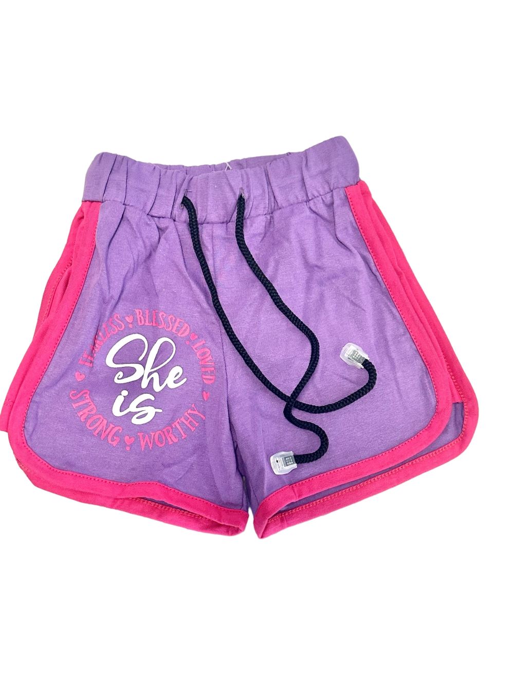Prezentujemy krótkie spodenki dla dziewczynek w kolorze fioletowym z różowymi lampasami po bokach, które dodadzą uroku każdej letniej stylizacji.