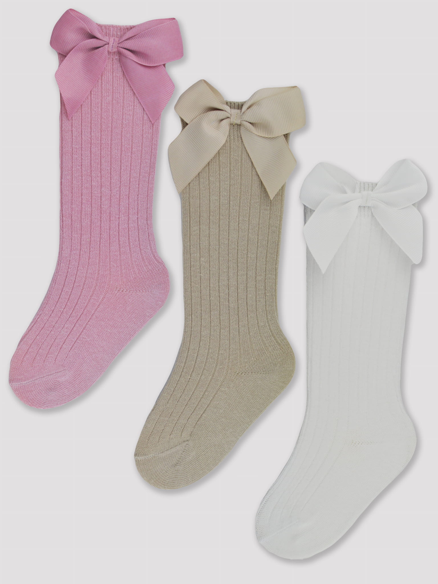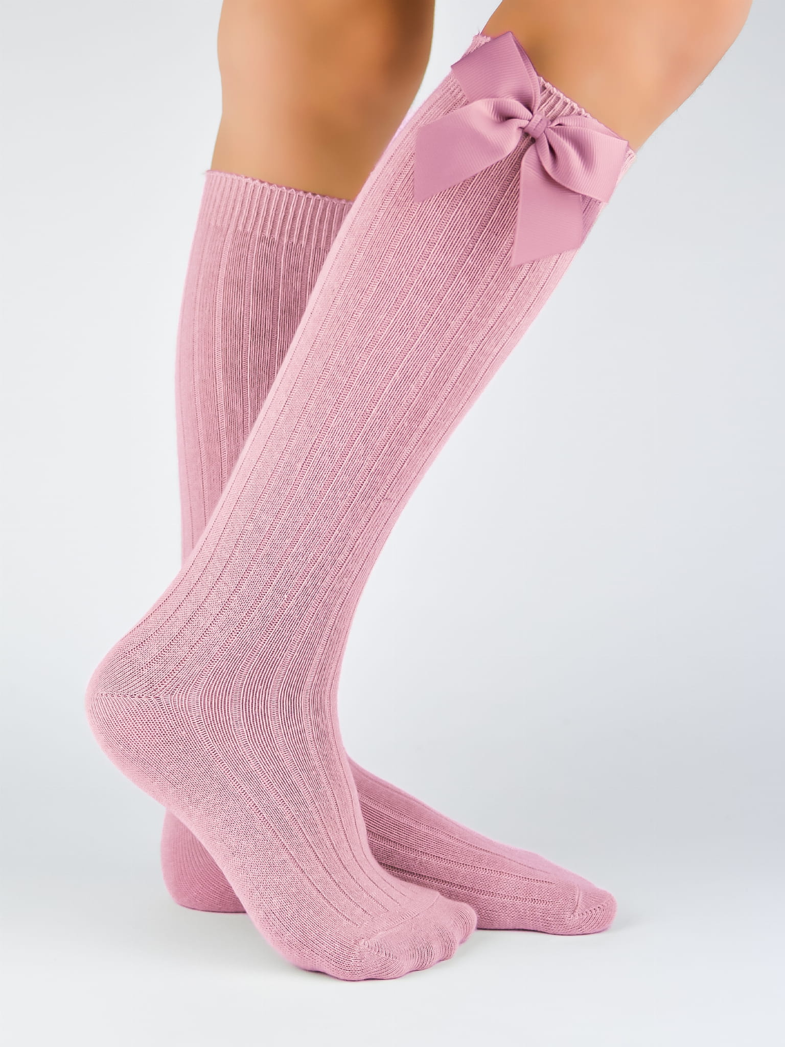 Bawełniane podkolanówki dla dziewczynki w kolorze różu z ozdobnymi kokardkami. Idealny dodatek do sukienek czy krótkich spodenek.