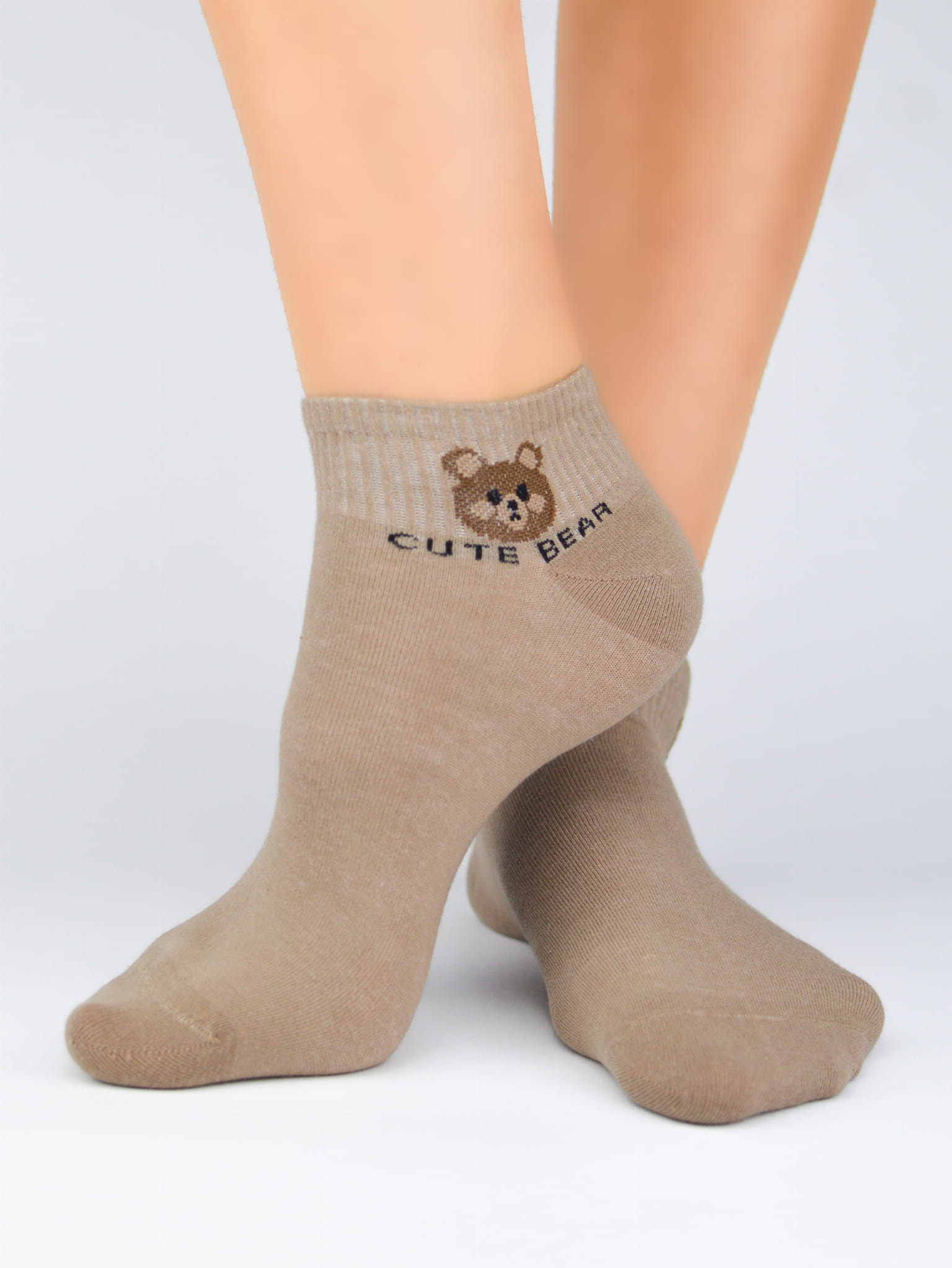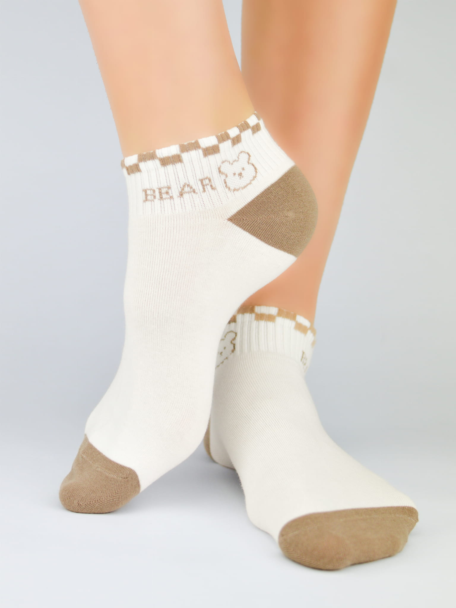 Skarpetki typu stopki za kostkę w kolorze ecru z dodatkiem brązu w uroczy wzór misia i kokardek. Skarpetki są z delikatnej bawełny z dodatkiem poliestru i elastanu. Ściągacz nieucisający. Płaskie, niewidoczne szwy