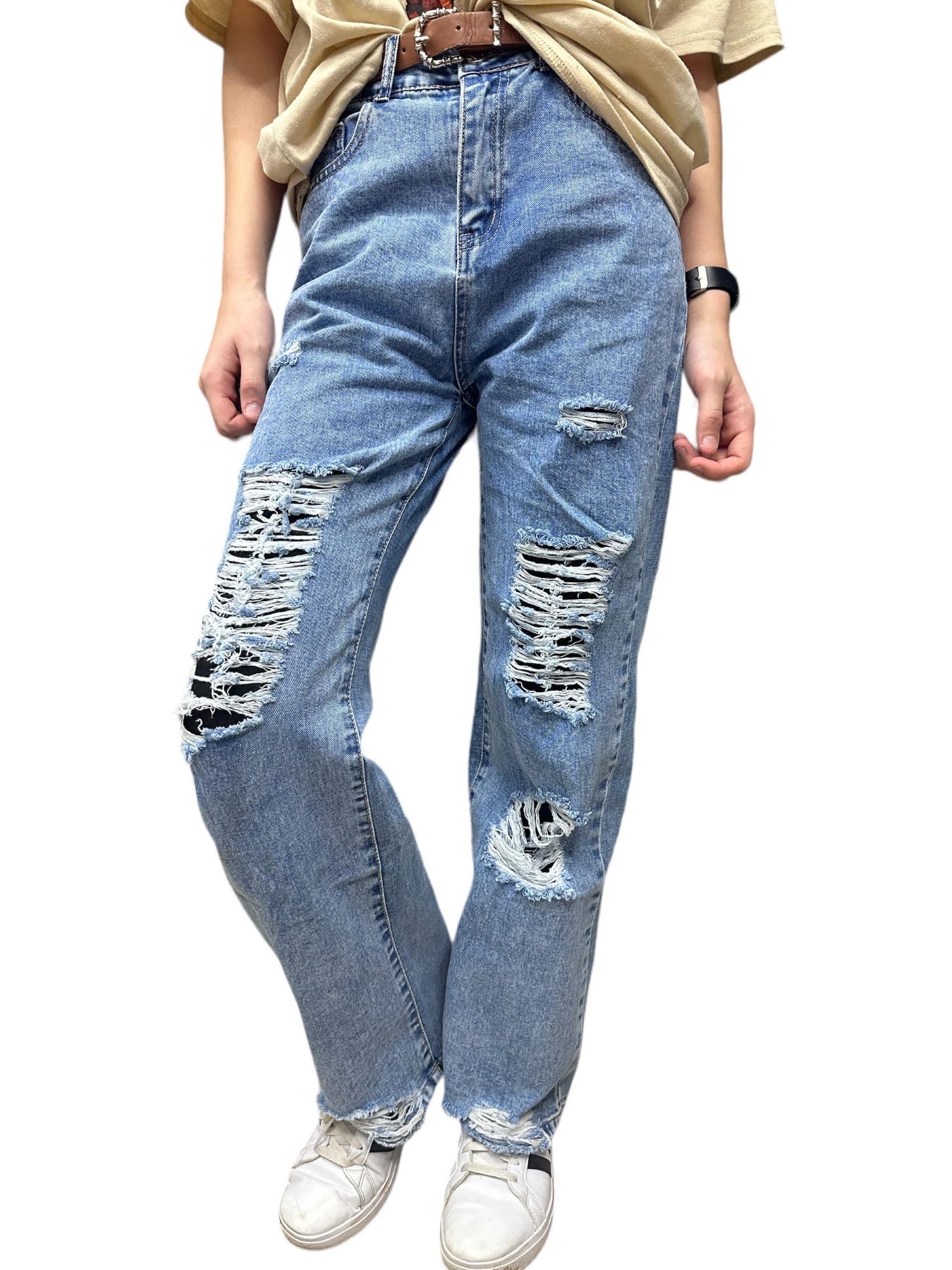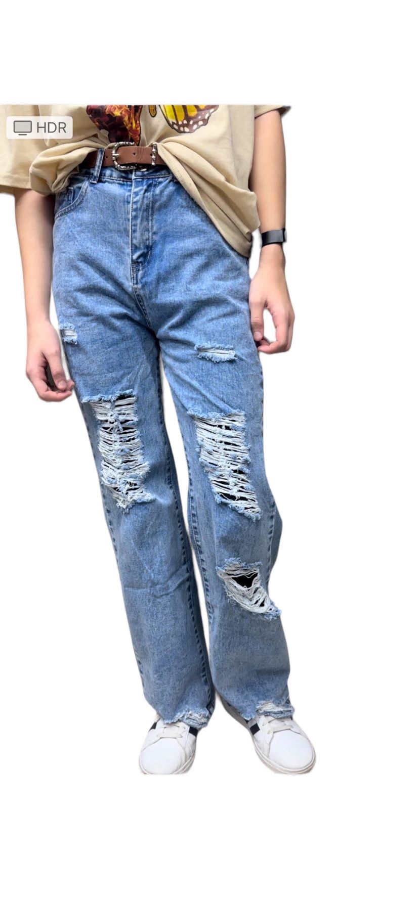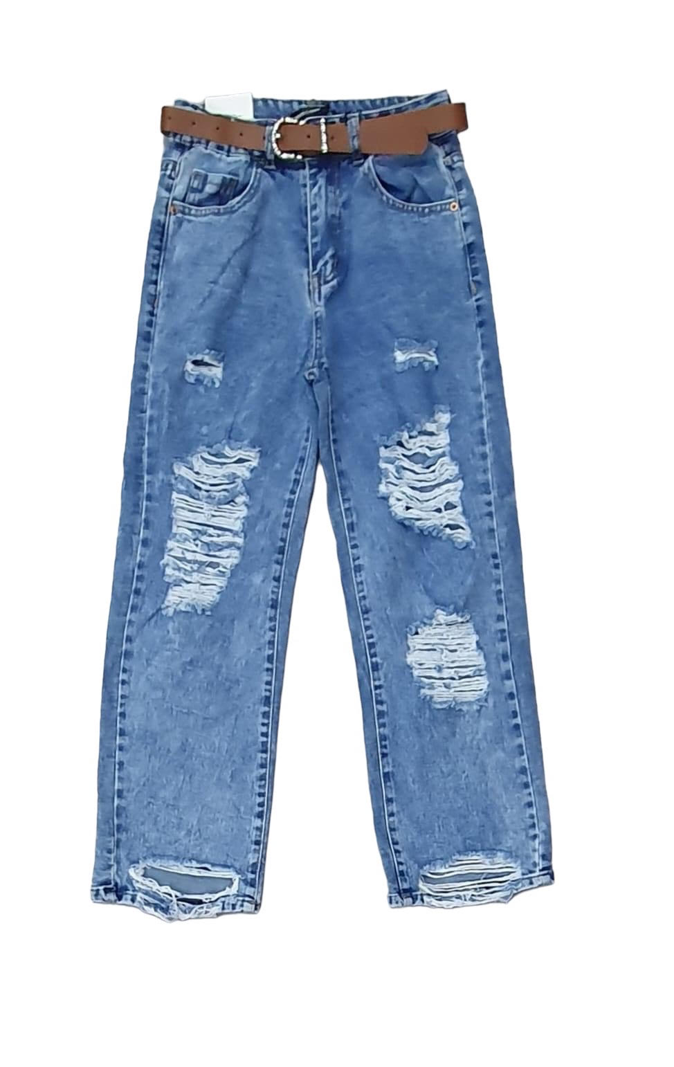 Super Modne Jeansy dla dziewczynki z paskiem. Nogawki proste, szerokie. Z przodu pazura dodają przetarcia. Tył gładki.